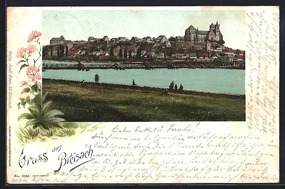 Lithographie Breisach, Ortspanorama mit Uferpartie, Blume