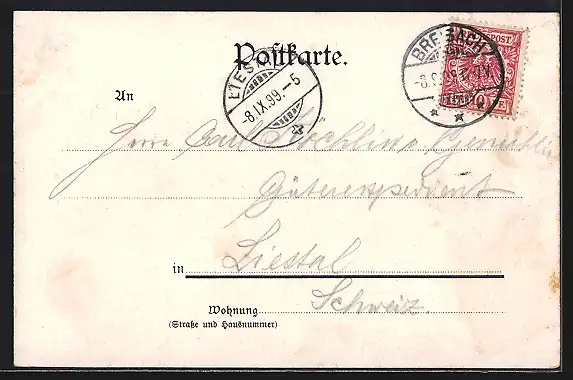 Personenbezogene Daten auf der Rückseite der Karte wurden durch blauen Textmarker unkenntlich gemacht. Die blauen Stellen sind auf die Vorderseite durchgeweicht und wirken sich negativ auf das Postkartenfoto aus