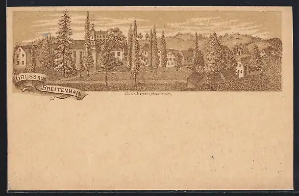 Lithographie Breitenhain / Lucka, Ortspartie mit Kirche aus der Vogelschau