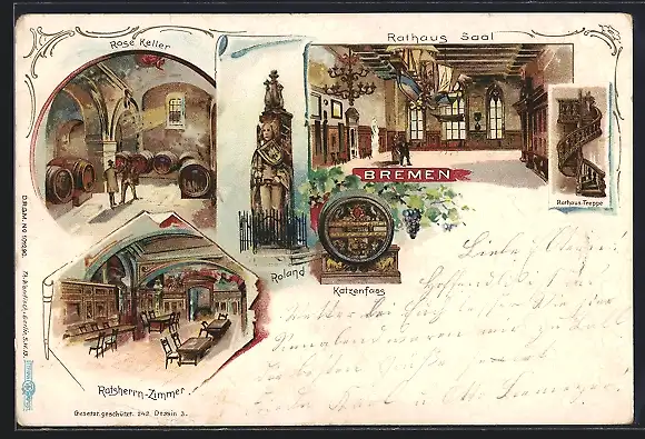 Lithographie Bremen, Rathaus Saal, Roland, Rose Keller, Ratsherrn-Zimmer