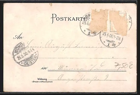 gelaufen 1900, Briefmarke entfernt, rückseitig Oberflächenschaden, Bugspur unten li., guter Zustand