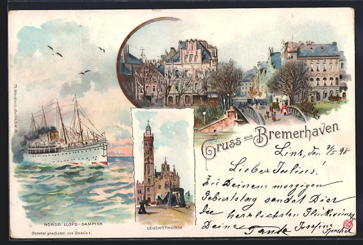 Lithographie Bremerhaven, Leuchtturm, Teilansicht mit Brücke