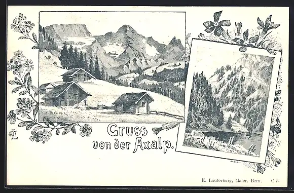 Lithographie Brienz, Axalp, Ortsansicht in den Bergen, Seepartie