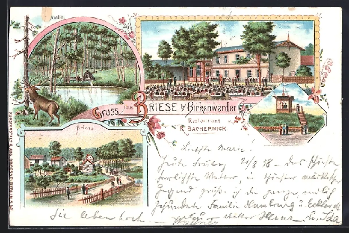 Lithographie Briese, Ortsansicht, Restaurant R. Bachernick, Hirsch an der Quelle
