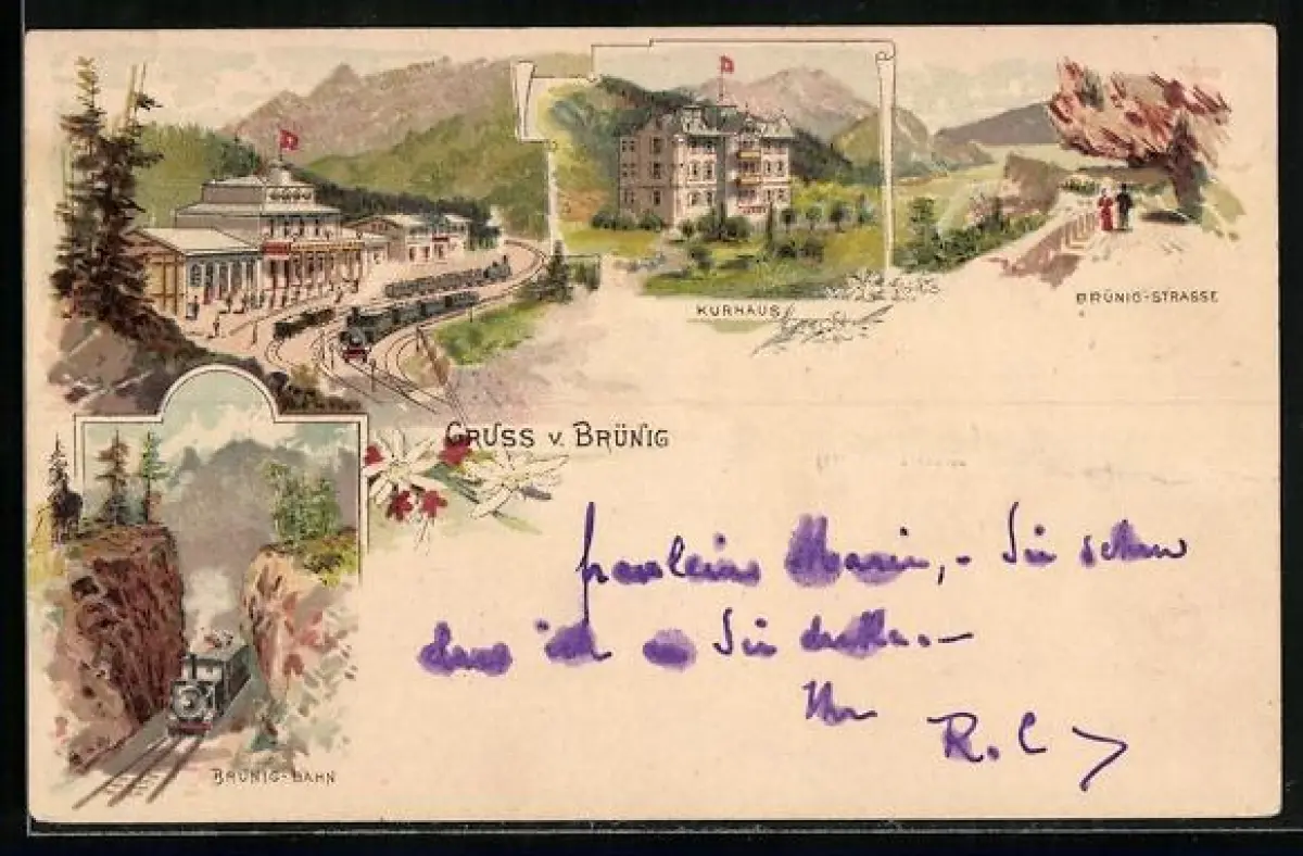 Lithographie Brünig, Brünig-Bahn, Bahnhof, Kurhaus, Brünig-Strasse