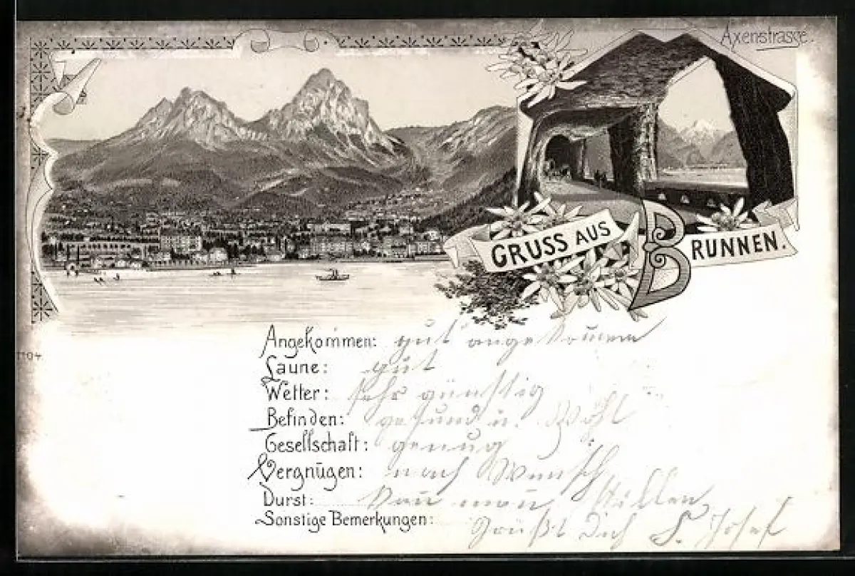 Lithographie Brunnen, Axenstrasse, Teilansicht