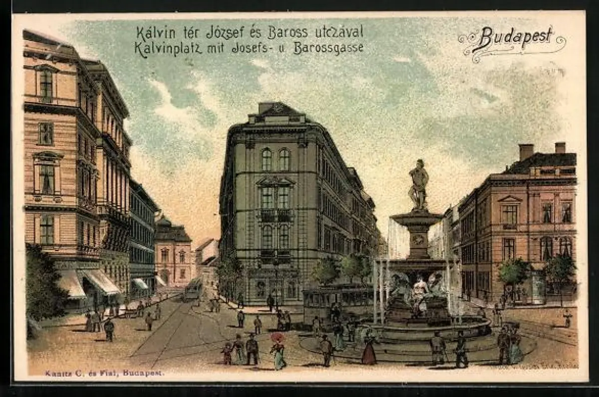 Lithographie Budapest, Kalvinplatz mit Josefs- und Barossgasse, Strassenbahn