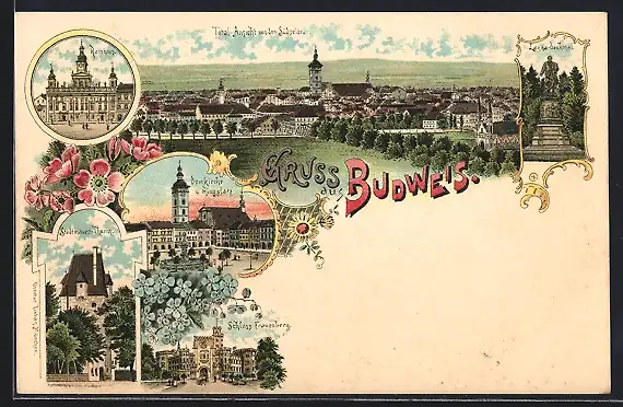 Lithographie Budweis, Domkirche und Ringlatz, Stadtmauer-Turm, Schloss Frauenberg, Rathhaus