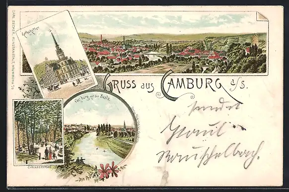Lithographie Camburg / Saale, Panorama mit Rathskeller und Cyriaskirche