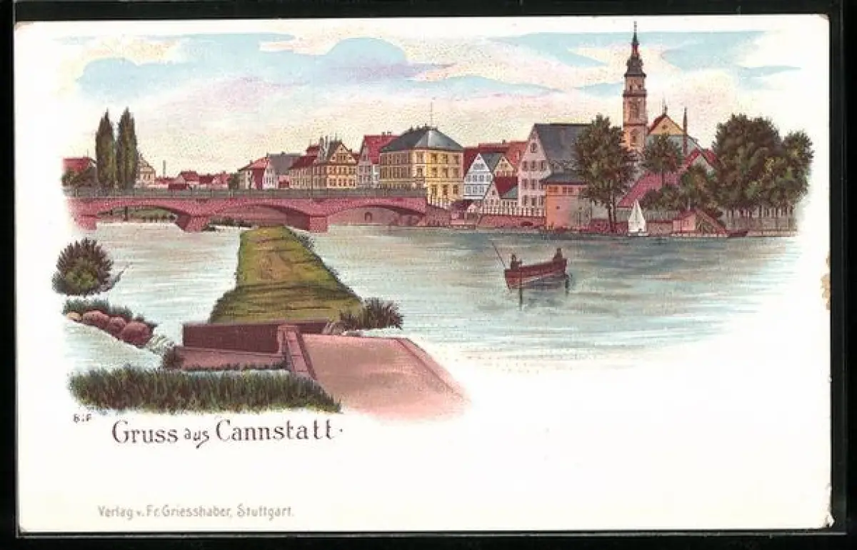Lithographie Cannstatt, Stadtansicht mit Neckarbrücke und Kirche