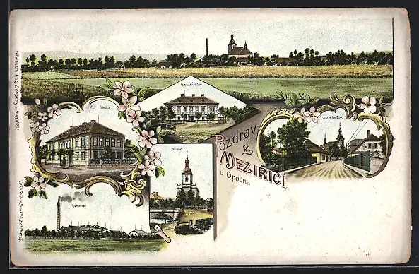 Lithographie Ceske Mezirici, Cukrovar, Kostel, Skola, Obechni dum, Celkový pohled