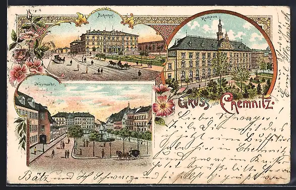 Lithographie Chemnitz, Bahnhof, Rathaus, Neumarkt
