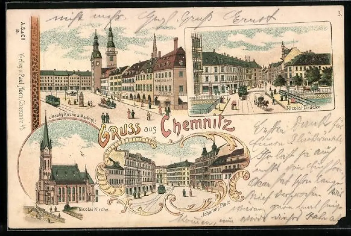 Lithographie Chemnitz, Jacoby Kirche mit Strassenbahn, Nicolaikirche, Johannisplatz, Nicolaibrücke