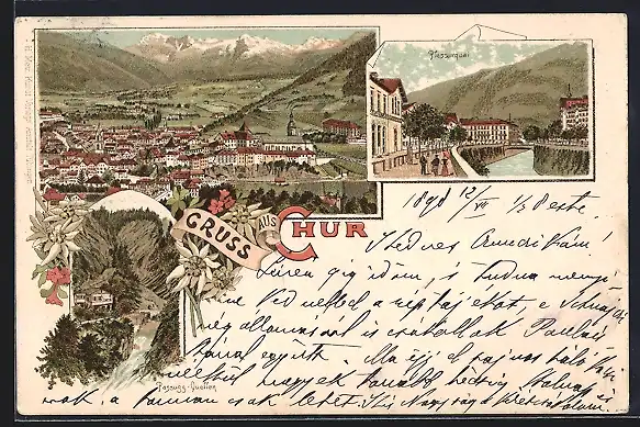 Lithographie Chur, Totalansicht, Passugg-Quellen, Plessurquai