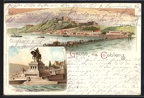 Lithographie Coblenz, Ehrenbreitstein hinter Stadtpanorama, Kaiser Wilhelm-Denkmal
