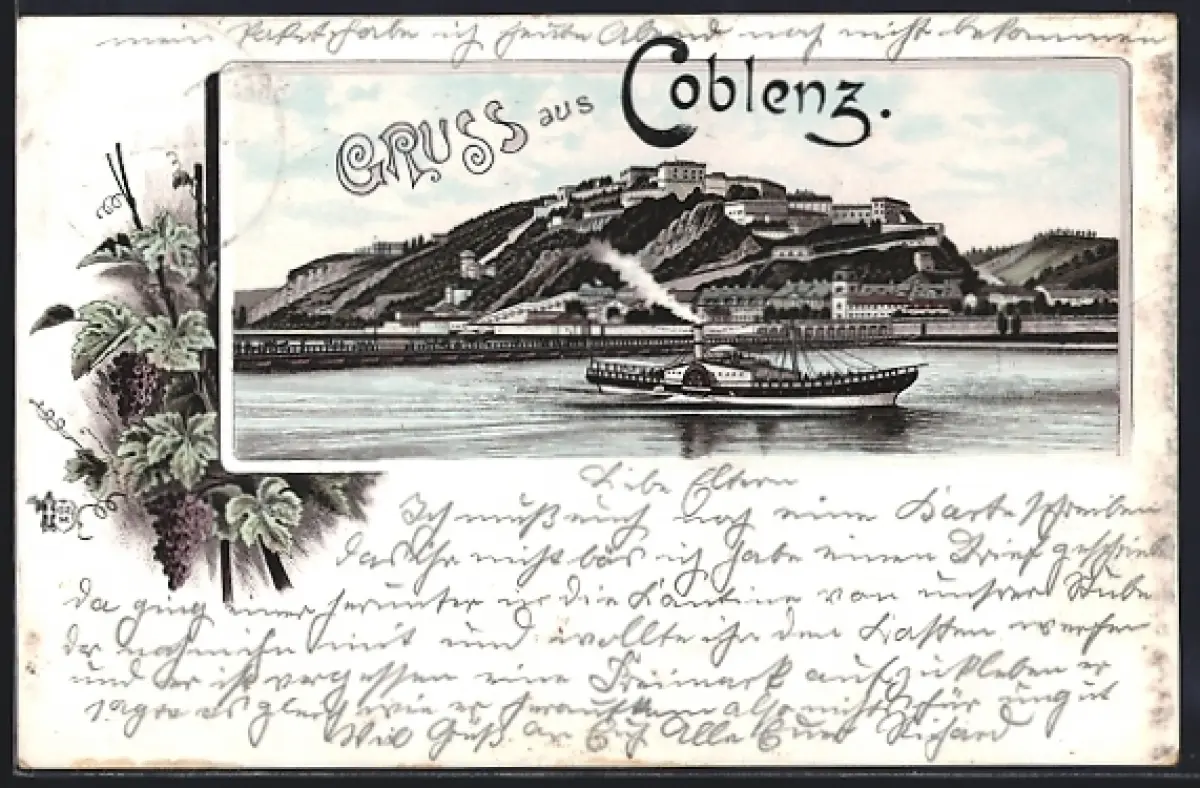 Lithographie Coblenz, Festung Ehrenbreitstein mit Rheindampfer, Weintrauben