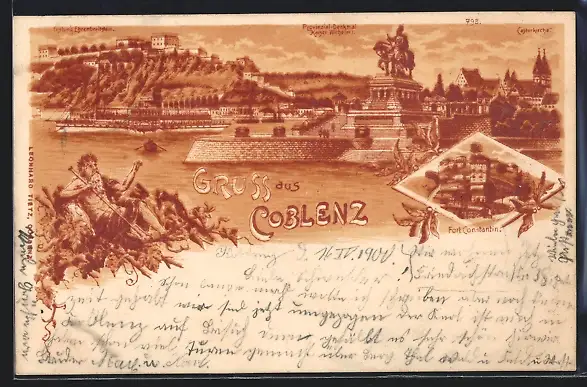 Lithographie Coblenz, Fort Constantin, Totale mit Provinzial-Denkmal Kaiser Wilhelm I.