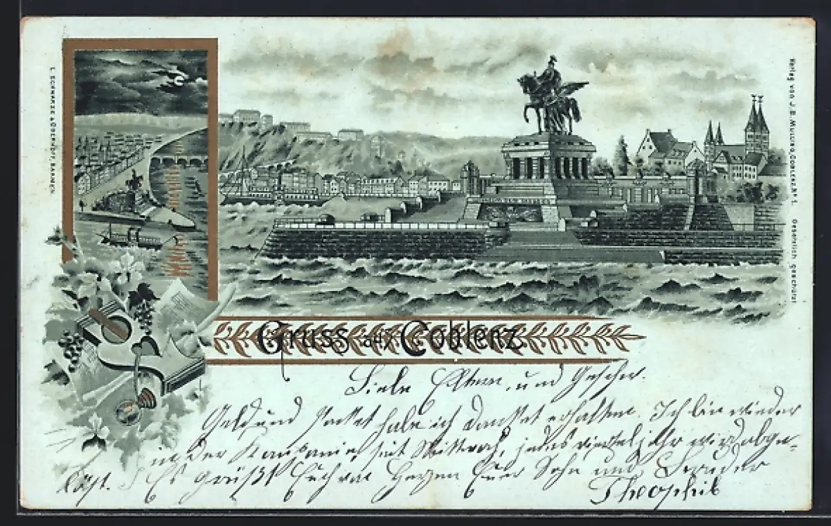 Lithographie Coblenz, Ortsansicht mit Denkmal Wilhelm I., Lyra und Trauben