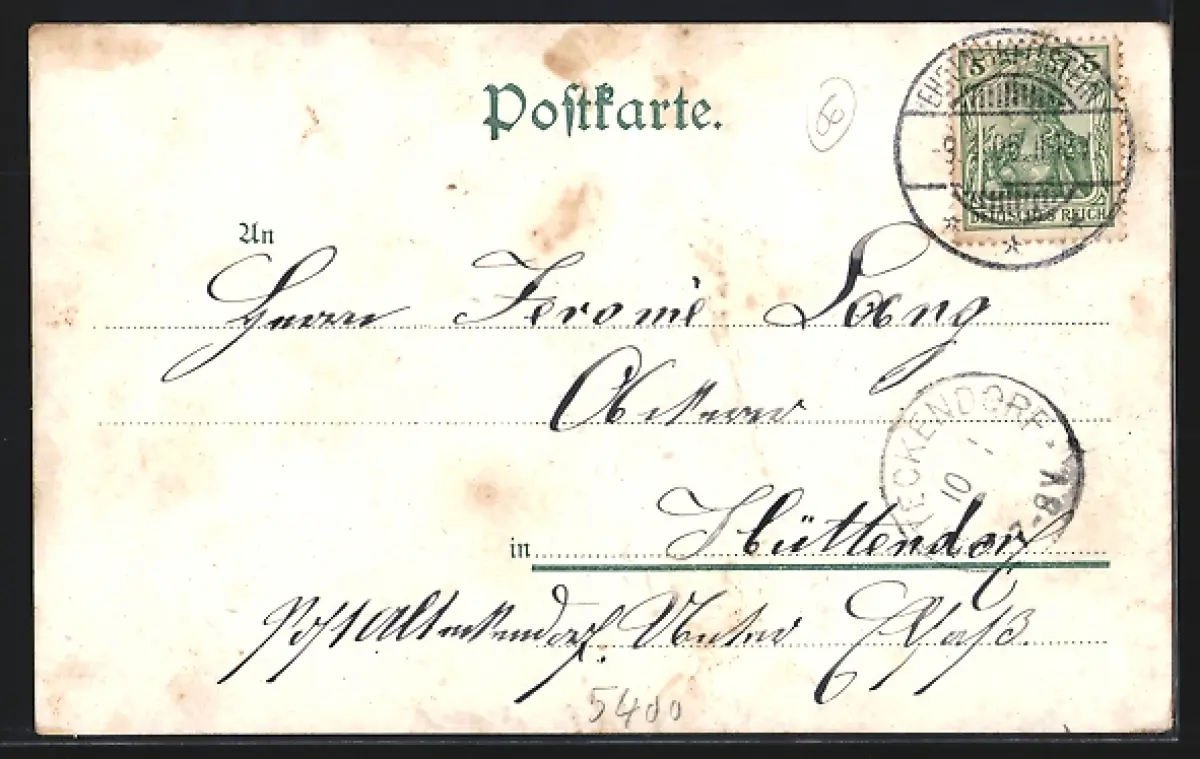 Personenbezogene Daten auf der Rückseite der Karte wurden durch blauen Textmarker unkenntlich gemacht. Die blauen Stellen sind auf die Vorderseite durchgeweicht und wirken sich negativ auf das Postkartenfoto aus