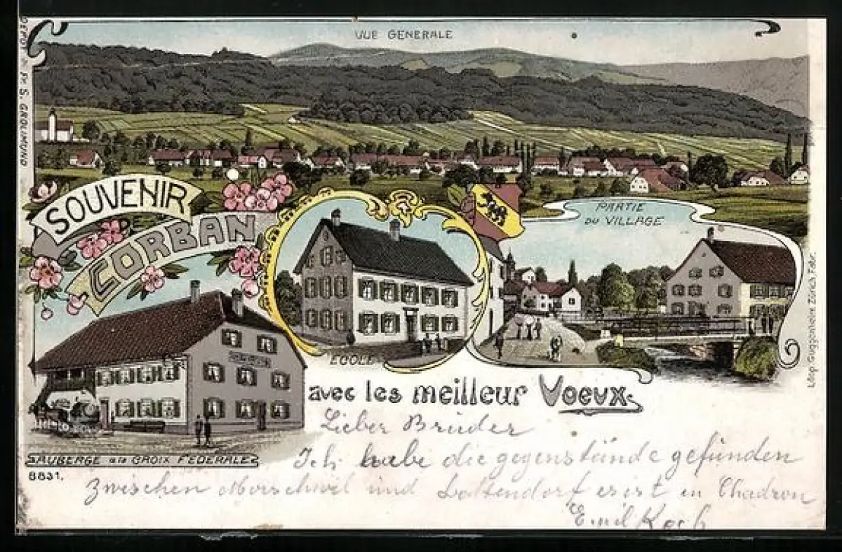 Lithographie Corban, Auberge a la Croix Federale, Ecole, Partie du Village
