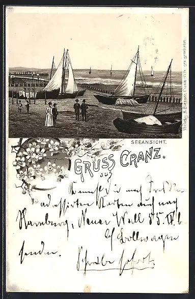 Lithographie Cranz, Strandpartie mit Segelbooten