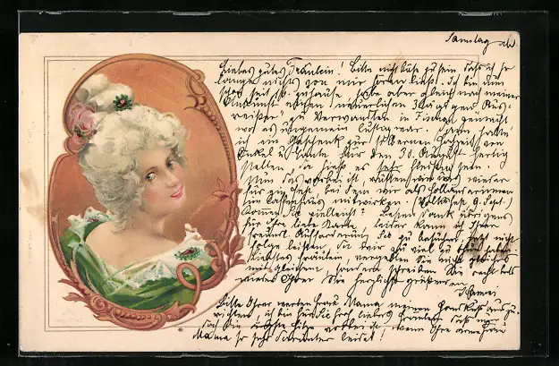 Lithographie Dame mit weisser Perücke in grünem Kleid, Jugendstil