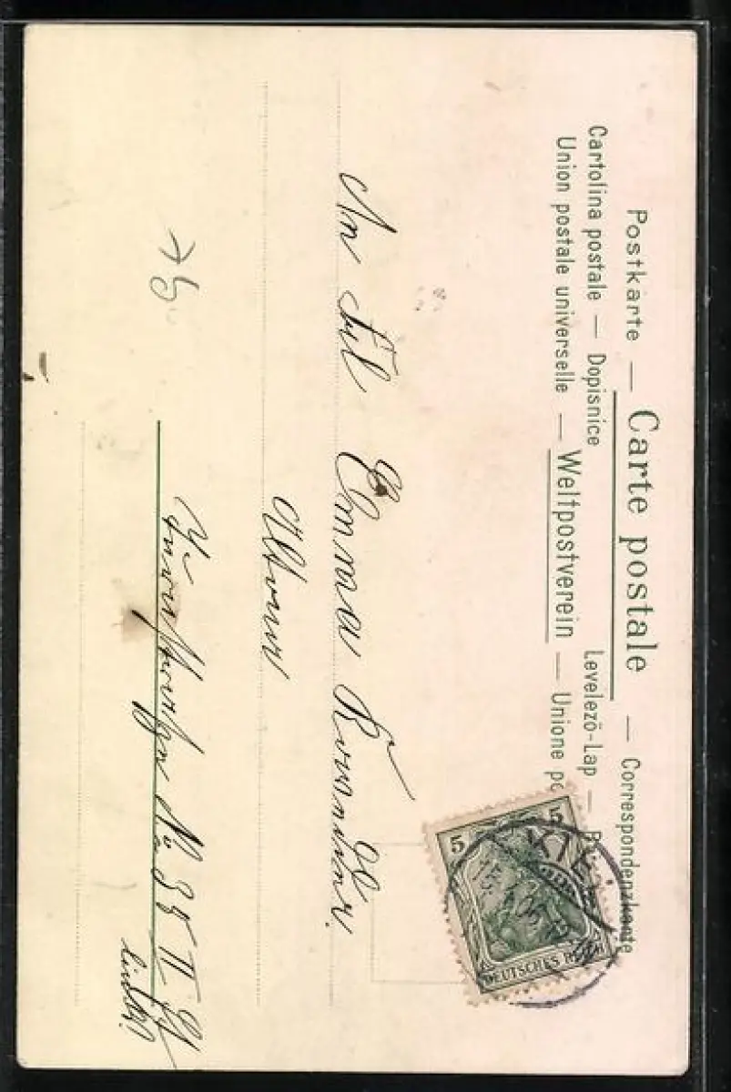 Personenbezogene Daten auf der Rückseite der Karte wurden durch blauen Textmarker unkenntlich gemacht. Die blauen Stellen sind auf die Vorderseite durchgeweicht und wirken sich negativ auf das Postkartenfoto aus