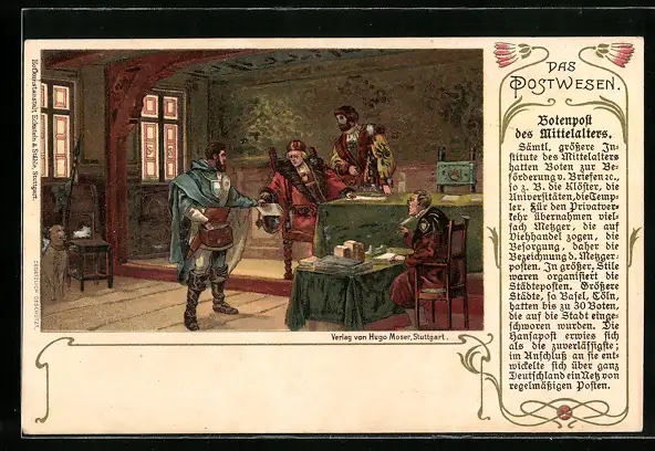 Lithographie Das Postwesen, Botenpost des Mittelalters, Auslieferung eines Briefes in einem Kontor