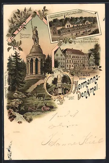 Lithographie Detmold, Hotel Frankfurt, C. Reinikes Gasthof z. Hermmannsdenkmal, Hermanns Denkmal, Bismarckstein