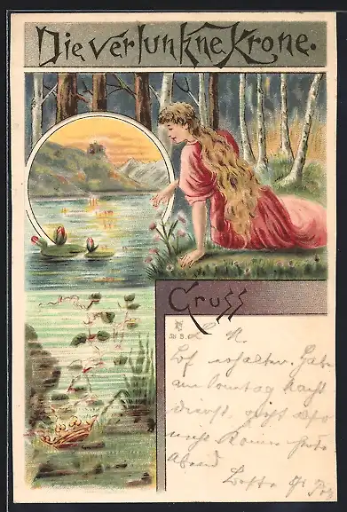 Lithographie Die versunkne Krone, Prinzessin sitzt am Ufer und blickt zum Grund