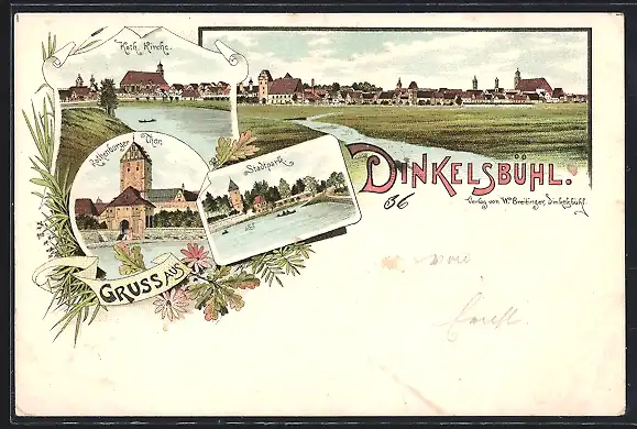 Lithographie Dinkelsbühl, Rothenburger Tor, Stadtpark, Kath. Kirche