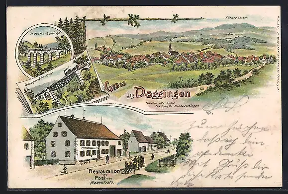 Lithographie Döggingen, Restaurant und Post von Hasenfratz, Gauchachbrücke, Mauhachbrücke, Totalansicht