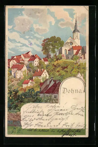 Lithographie Dohna, Ortsansicht mit Kirche