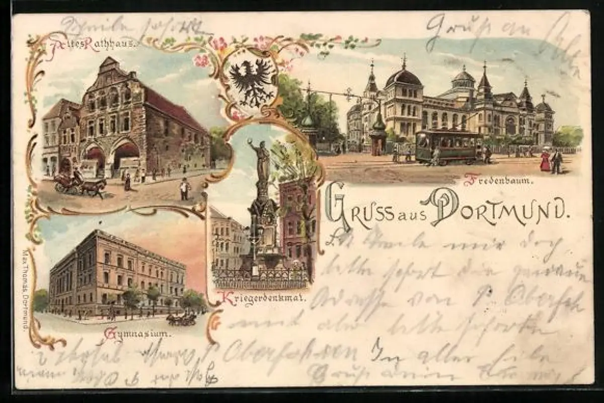 Lithographie Dortmund, Altes Rathaus, Kriegerdenkmal und Fredenbaum