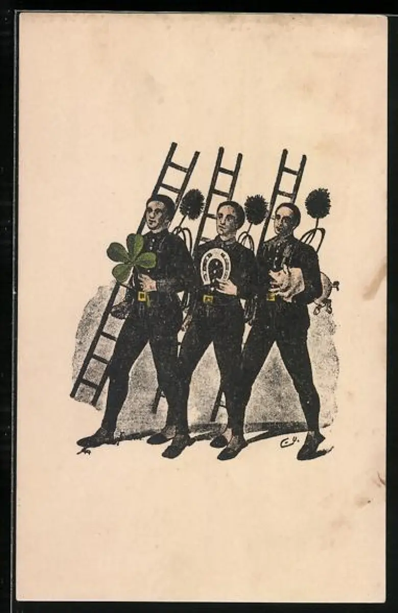 Lithographie Drei Schornsteinfeger mit Klee, Hufeisen und Schwein