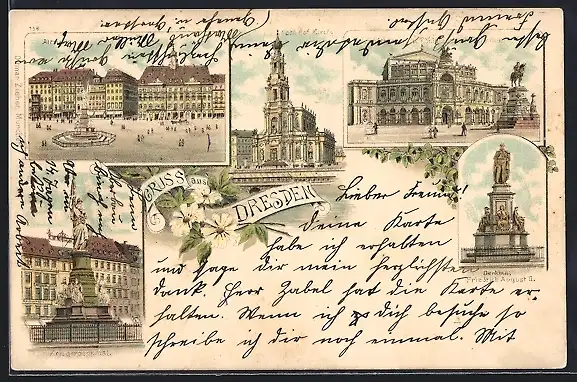Lithographie Dresden, Altmarkt, Denkmal Friedrich August II, Kriegerdenkmal
