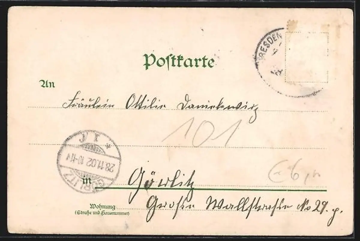 gelaufen 1902, Briefmarke entfernt, rückseitig Oberflächenschaden, Eckknicke li. oben u. re. unten, Stempelspur, Bugspur li. unten