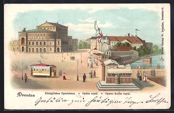 Lithographie Dresden, Königliches Opernhaus mit Strassenbahn