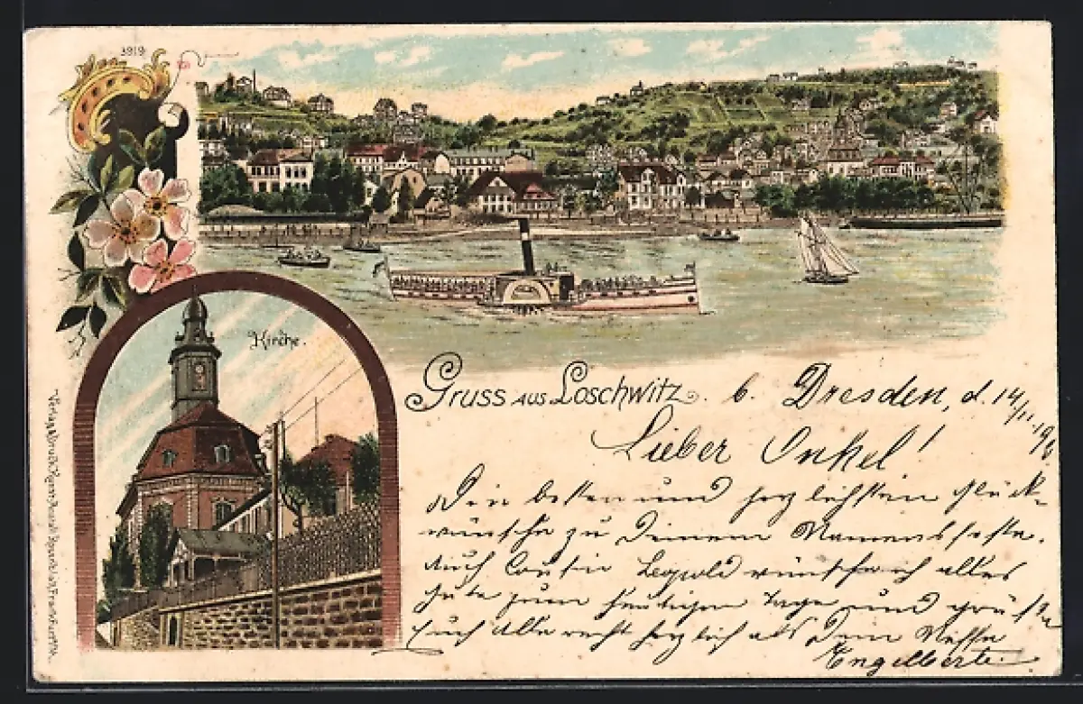 Lithographie Dresden-Loschwitz, Panorama mit Dampfer, Kirche, Blumendekor