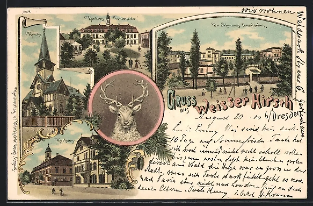 Lithographie Dresden-Weisser Hirsch, Kurhaus Promenade, Kirche, Kurhaus, Dr. Lahmann's Sanatorium