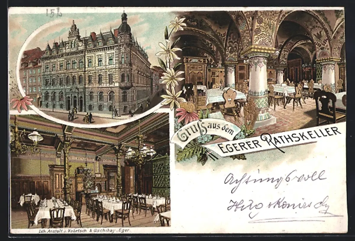 Lithographie Eger, Gasthof Ratskeller, Aussen- und Innenansicht