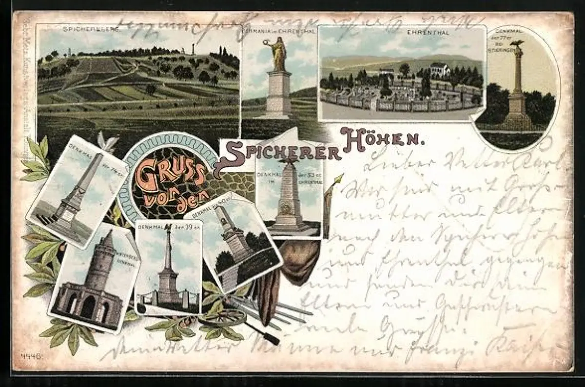 Lithographie Ehrental, Spicherberg mit Denkmäler auf den Spicherer Höhen
