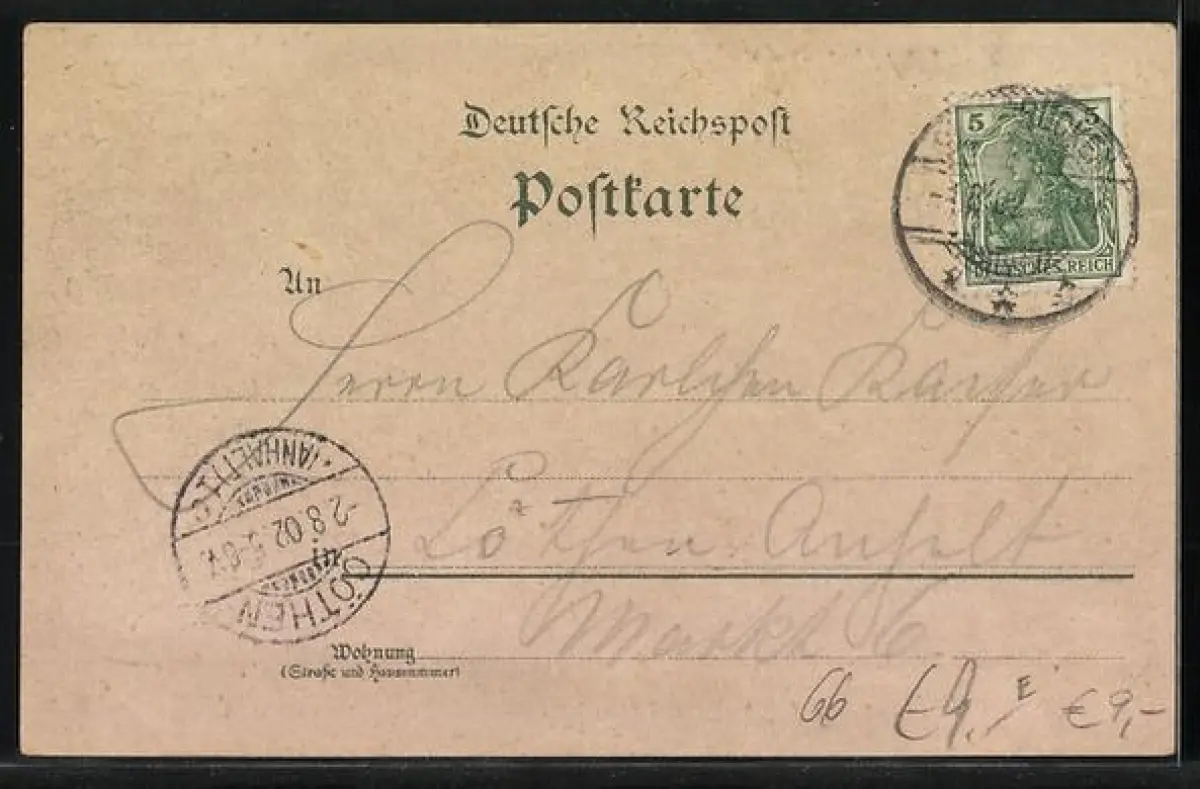 Personenbezogene Daten auf der Rückseite der Karte wurden durch blauen Textmarker unkenntlich gemacht. Die blauen Stellen sind auf die Vorderseite durchgeweicht und wirken sich negativ auf das Postkartenfoto aus