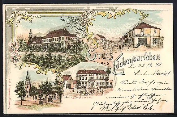 Lithographie Eichenbarleben, Gasthof zur Post, Handlung von H. Pfeffer