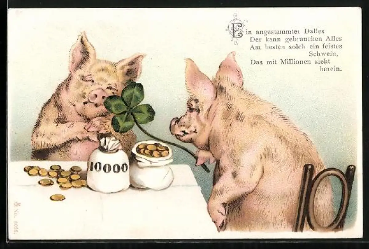 Lithographie Ein Schwein kitzelt ein anderes mit einem Kleeblatt