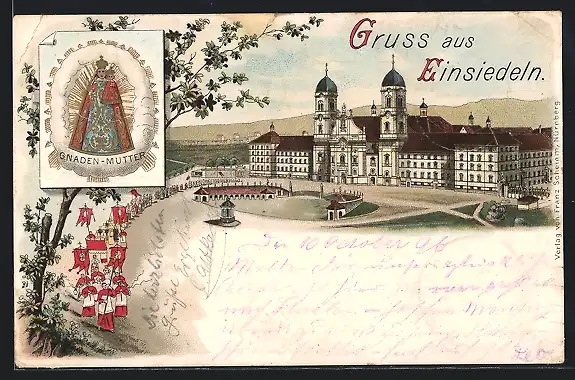 Lithographie Einsiedeln, Gebäudeansicht mit Prozession, Gnaden-Mutter-Symbol
