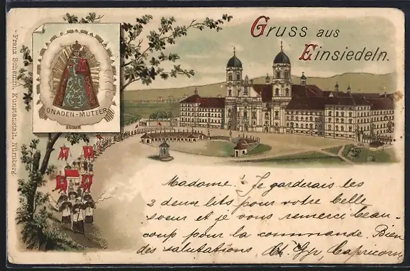 Lithographie Einsiedeln, Prozession vor dem Kloster, Gnaden-Mutter