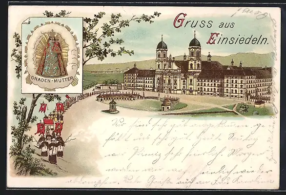 Lithographie Einsiedeln, Prozession vorm Kloster, Gnaden-Mutter