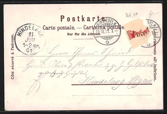 gelaufen 1901, Briefmarke entfernt, rückseitig Oberflächenschaden, kleiner Einriss oben mittig, guter Zustand