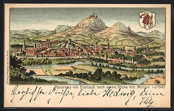Lithographie Eisenach, Alte Ansicht nach Merian von 1630